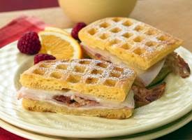3. On each of first 2 toasted waffles, layer 1 Swiss cheese slice, 2 ham slices, 1 bacon slice, 1 Swiss cheese slice, 1 bacon slice, 2 turkey slices and 1 Swiss cheese slice (evenly arrange cheese so sandwich will hold together). Top each with remaining hot waffle, toasted side down. Cook about 2 minutes or until bottom waffles are browned.