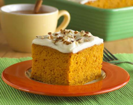 “Pumpkin cake adds a warm glow to the end of any meal with its subtle blend of spices and a rich cream cheese icing.”