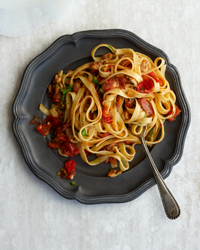 Clams and bacon form a delectable union enhanced by wine-flavored tomato sauce. We recommend chopped clams, which are sold in refrigerated containers in many fish shops and at supermarkets, but you can also use good-quality canned clams.