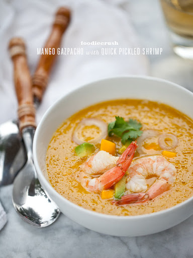 Set aside ¼ cup each of red onion and mango. Put the rest of the ingredients except cilantro in a blender. Pulse 5-8 times. If you like your gazpacho chunky, reserve 1 cup of mixture at this and add after blending the rest of the ingredients until smooth. If you a smoother gazpacho, go ahead and blend it all at once. Chill in the refrigerator for 30 minutes for flavor to meld. Serve with cilantro and avocado and top with pickled shrimp.