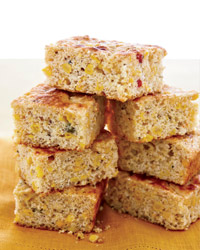 Corn relish provides all the seasoning required for this slightly sweet corn bread. The relish also adds heft, making the corn bread substantial enough to serve as a vegetarian lunch with a green salad and some sliced tomatoes.