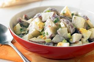 MIX dressings and mustard in large bowl. Add potatoes, eggs and onions; mix lightly.