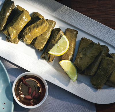 Remove from heat and allow grape leaves to cool in liquid to room temperature. Gently remove filled grape leaves from liquid and place on platter. DO AHEAD: Can be made 3 days ahead. Cover and chill.