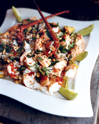 Scatter the lobster and avocados over the cellophane noodles. Drizzle with the chile-honey dressing. Garnish with the peanuts, mint, cilantro and lime wedges and serve right away.