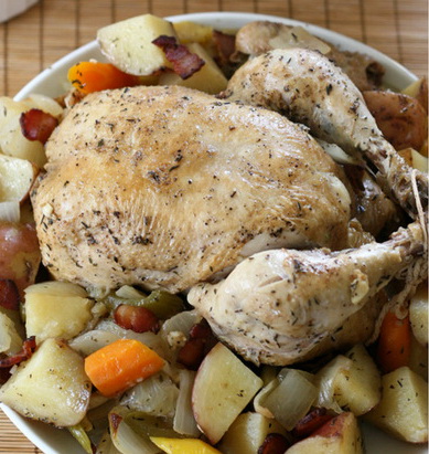 This was super good and tender. We usually aren't big fans of crockpot chicken b/c the chicken seems to stick to our teeth, if that makes any sense. But cooking a whole chicken without any extra water helped the texture a lot. I used dried thyme leaves (I just sprinkled it in) and a few sprays of bottled lemon juice (Emeril would sure not approve ;). I served it with "Make-Ahead Twice-Baked Potatoes" and steamed peas. Tasty!