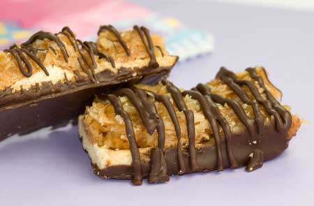In our region, these popular Girl Scout cookies are called Caramel Delites, but we call them Samoas anyway. It’s just a more interesting name, plus if you compare the not-so-minor differences between the two cookies, you might suspect that the Samoas are just plain better. But that’s subjective, of course. Either way, ours are all gone and it seemed like a good day to try making them in bar form.