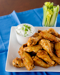 Most of us think of Buffalo wings as bar food, but with their accompaniment of celery sticks and creamy blue-cheese dressing, they make a fine casual meal. These wings are hot, but if you like them incendiary, pass extra Tabasco sauce at the table.