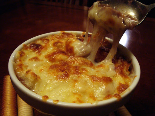When the onions are very brown and have gotten considerably smaller, add the sherry and cook until the sherry has reduced by half. Add the bay leaves, thyme bundle and chicken stock. Bring to a boil and reduce heat and simmer for at least 1 hour. TASTE for seasoning, you probably will need to season with salt. If the stock reduces too much add water to keep the liquid level up- this IS a soup after all. When done, the soup should be thick and very full flavored. TASTE! You may need to resason, caramelized onions are very sweet and require a fair amount of salt.