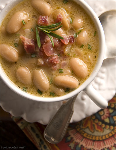 In a large soup pot, heat the olive oil over medium; add the pancetta and cook until lightly browned and crispy, about 7 to 8 minutes, stirring frequently. Remove with a slotted spoon to a paper towel to drain. Set aside. Add the onions to the hot oil, season with some salt and pepper and cook until they begin to soften, about 5 to 7 minutes. Add in the garlic and cook for 30 seconds more. Add one cup of the stock to the pan, scraping up any browned bits. Add the remaining stock, beans, bay leaves, rosemary, thyme and Parmesan rind, if using. Bring to a boil, cover, lower the heat and simmer for 15 minutes. Fish out the bay leaves, herb stems and Parmesan rind; add in the cream and Parmesan and cook until soup starts to thicken slightly, about 5 minutes more.