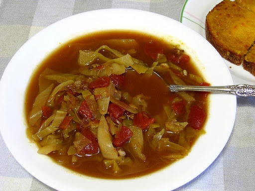 Stir in water, bouillon, salt, and pepper and spices. Bring to a boil, then stir in cabbage. Simmer until cabbage wilts, about 10 minutes.