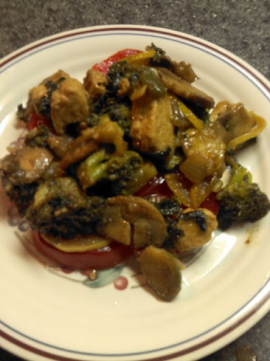 Although this was made with Quorn, a chicken alternative, by all means use the real thing if you prefer. I used fresh organic homegrown vegetables and served it over fresh tomatoes instead of rice or noodles to save on calories.