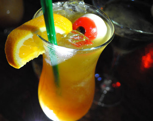 Add all ingredients into a shaker and shake. Pour into two hurricane glasses filled with ice. Garnish with orange slice and a candy eyeball.