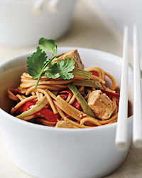A vast improvement on the usual sesame noodles made famous by a million Chinese take-out menus, this silky version includes chunks of tofu and sweet, crunchy slices of red bell pepper.