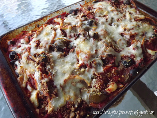 Prepare a baking pan with a drizzle of olive oil and spoonful of the sauce. Place the eggplant slices on the pan. Top with sauce, parmesan cheese and sauce. Place another layer of eggplant, sauce, cheeses and continue this process. End with the sauce and cheeses and a drizzle of olive oil.