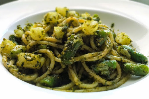 Cut up potatoes and cook with green beans (I used frozen) in large pot of salted boiling water. Add spaghetti to boiling water once potatoes are almost cooked.