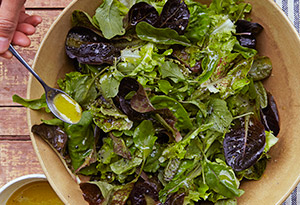 When you're serving a salad for a dinner party, put vinaigrette in the bottom of a serving bowl and place greens on top. This can sit for an hour or 2. When ready to serve, toss greens and serve immediately.