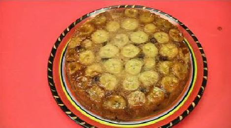 Next, spread 3 Tbs room temperature butter into a 9-inch nonstick cake pan and top that with 1/2 cup light brown sugar.....and then place a layer of 3/4-inch thick slices of banana over that.
