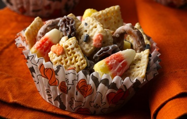 Gently stir in cereal, pretzels and raisins until evenly coated. Stir in candy corn and decors.