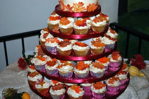 Frost filled cupcakes with Maple Frosting. If desired, use pastry bag with star tip to swirl frosting onto cupcakes. Can be decorated with gold or silver dragees, chopped walnuts or a single candy corn. I made sparkly fall fondant leaves for each cupcake and piled these high on a cupcake tier for our wedding reception.