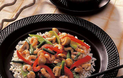 .2Heat olive oil in large skillet or wok over medium-high heat. Add snow peas, green onions and red bell pepper; cook and stir-fry for about 2 minutes.
