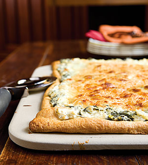 3. In a large saucepan, cook onion, green onion, and garlic in remaining 1 tablespoon olive oil over medium heat for 4 minutes. Add spinach, and cook for 5 minutes, or until spinach is wilted and all liquid cooks out. Add cream cheese, salt, and Italian seasoning and cook, stirring frequently, until well blended. Spread mixture onto prepared crust. Top with mozzarella and Parmesan cheeses.