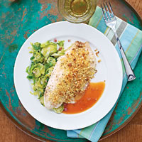 Nutrition Info: Each serving (1 fillet, 1/4 cup sauce) contains 320 calories, 11 g carbohydrate, (0 g fiber), 39 g protein, 14 g fat, (7 g saturated fat), 100 mg cholesterol, 240 mg omega-3 fats, and 510 mg sodium.