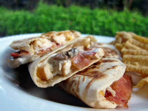 Top one half of tortilla with chicken, bacon and mushrooms.