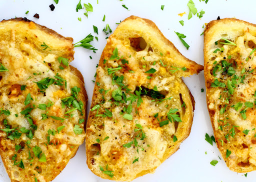 Whisk Sriracha, minced garlic, and melted butter in a small bowl; brush over cut sides of bread. Sprinkle with grated Pecorino or Parmesan and broil until toasted.
