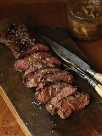 Carve hanger steak into 3/4-inch slices and return to skillet, arranging atop vegetables.