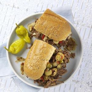 To use frozen meat: Thaw in refrigerator overnight. Place in Dutch oven; heat through. Using slotted spoon, place 1/2 cup on each bun. Top with cheese and giardiniera if desired.
