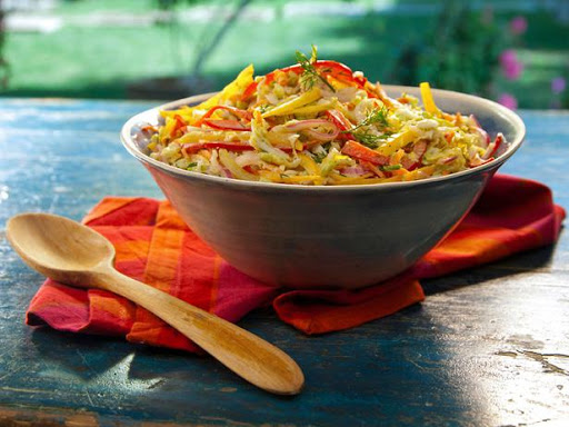 Whisk together the mayonnaise, olive oil, lime zest, lime juice, dill, sugar, celery salt and cumin seeds in a large bowl. Season with salt and pepper. Add the cabbage, carrots, onions and peppers, and toss to coat in the dressing. Season with salt and pepper. Cover and refrigerate for at least 1 hour and up to 4 hours before serving.