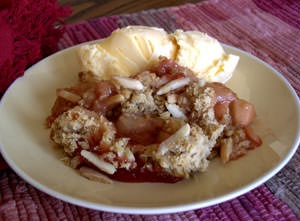8. Spoon the streusel topping over the filling. Bake the cobbler for 20 to 25 minutes or until the top begins to brown.