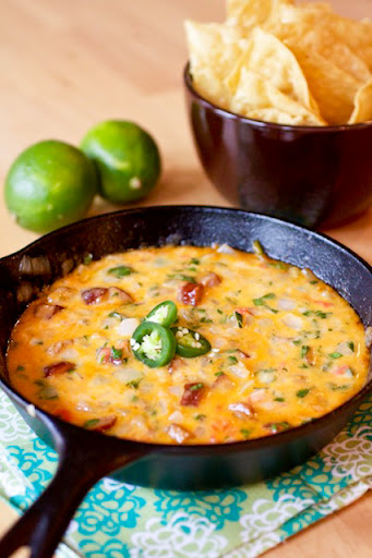 And omgosh, this is a happy cheese dip. Smoky chorizo (thanks for the suggestion, Annie!) is mixed in with handfuls of cheese and more of the usual Tex-Mex suspects: onion, tomato, jalapeño, and cilantro. The chorizo actually cuts through all the cheese and adds a bit of needed “heft” to the dip. It’s a glorious combination of ingredients and takes less than 10 minutes to pull together. And it was gone almost as quickly. Along with nearly an entire bag of chips. Salads really do pay off when dinner looks like this one. :) Our dip did turn out just a little runny and I’m pretty sure it’s because of the excess liquid from chorizo so make sure you drain it off before adding the tomatoes, onion, and jalapeño. But honestly, this didn’t detract from the cheesy goodness at all. The recipe calls for “Mexican melting cheese” (see the recipe below) of which I could not find during my change-of-dinner-plans-on-whim grocery store trip, though I’m sure stores like Whole Foods or ethnic food marts definitely carry one of them.
