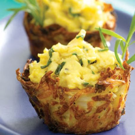 Don't put all your eggs in one basket. Instead, stuff these delicious mascarpone- and herb-flavored scrambled eggs into individual baskets made with hash brown potatoes.