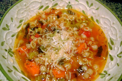 Add the macaroni to the soup and garnish with a little extra olive oil and grated cheese.