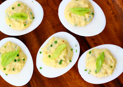 Mash the yolks of halved hard-boiled eggs with mayonnaise, Dijon mustard, Sriracha, minced celery, and fresh chives; spoon into egg whites and garnish with celery leaves.
