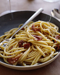 "I love knowing that I have leftovers in the refrigerator," says Shelley Lindgren. She'll often make pasta during the day—like this rich, pancetta-studded bucatini that's tossed with plenty of freshly ground black pepper and Pecorino—and then reheat a big bowl of it when she comes home from work late at night.