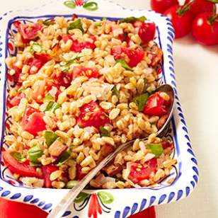 In this healthy farro salad recipe we combine it with smoky bacon, sweet cherry tomatoes and fresh basil for an easy side dish or light lunch. Look for farro at natural-foods stores and gourmet food markets.