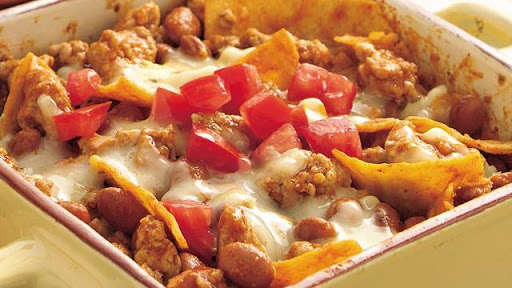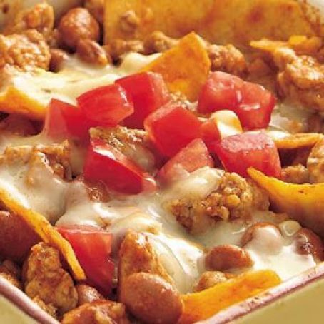 In ungreased 2-quart casserole, stir pork, beans, taco seasoning mix, enchilada sauce, water and tortilla strips until well mixed.