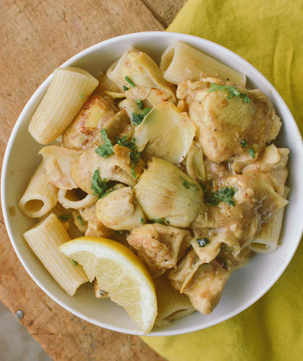 Cut the artichoke hearts in half lengthwise. Cut the chicken into bite-sized pieces, about 1 inch to a side. In a medium bowl, mix the flour with about 1 teaspoon salt and a generous quantity of black pepper. Toss the chicken pieces in the flour.