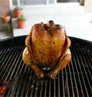 Rub the chicken and its cavity down with the vegetable oil. Season the chicken with rub mixture, remembering to season the cavity. Pour out 1/4 of the beer and sit the chicken on top of the beer can. Place the chicken in the center of the hot grill and cover. Cook the