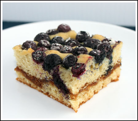 MY NOTES: No blueberries on top! At least flour them and add them to the cake filling. Or drop dollops of canned pie filling or fruit jam on top of the cake, saving a little of the batter to drop on top of the fruit in dollops.