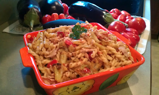 Clean and dice veggies, and put tomatoes, eggplant, and peppers in large bowl. Pour garlic and olive oil mixture over vegetables and toss until thoroughly coated. Spread onto lined cookie sheet and sprinkle with salt and pepper.