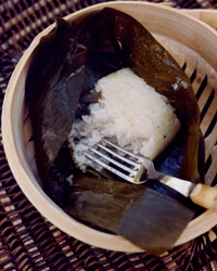 Cut the remaining 2 banana leaves into ten 8-inch squares. Place about 1/2 cup of rice in the center of each square and press to form 4-inch cakes; fold the leaves over the rice to make square packages.
