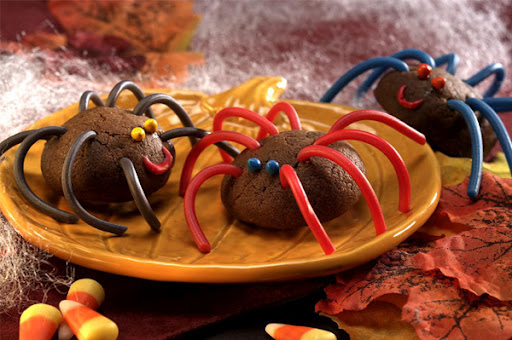 Spider bites are delicious little bites of chocolate cookie with licorice legs and frosting eyes. If you'd like, 'glue' candy eyes with a dab of frosting.