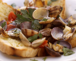 Rub some raw garlic on the toasted bread slices. Drizzle the bread with the extra virgin olive oil. Serve the clam soup in bowls with 2 half slices of toast per bowl.