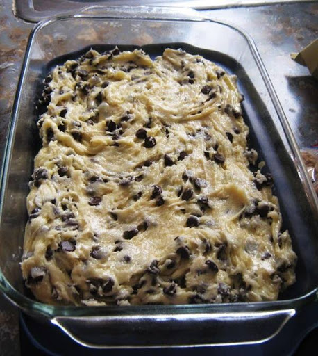 - 1 box yellow or white cake mix 2 eggs beaten 5 T melted butter 2 C mini chocolate chips Mix together, refrain from eating it raw, put in a greased 9×13 pan and bake at 350 for 20 min