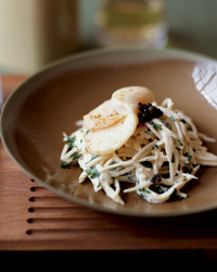 Mound the celery remoulade on plates and set the scallop clovers on top. Garnish with caviar and serve.