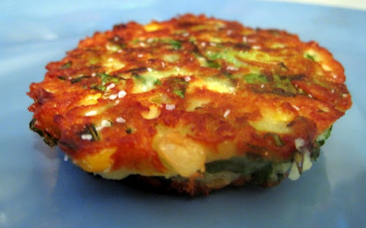 All of the veggies in these delicious fritters came from my CSA this afternoon. I was trying to find a way to use up the kale and corn in one fell swoop, and stumbled across this recipe. These fritters are really yummy and I can’t wait to have one with a fried egg on top for breakfast tomorrow morning