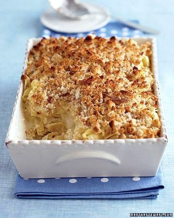 Place bread in food processor; pulse until very coarse crumbs form (you should have about 3 cups). Add reserved melted butter, and pulse just to moisten. Scatter crumbs over pasta in baking dish. (If making ahead, cover and refrigerate up to 1 day.)